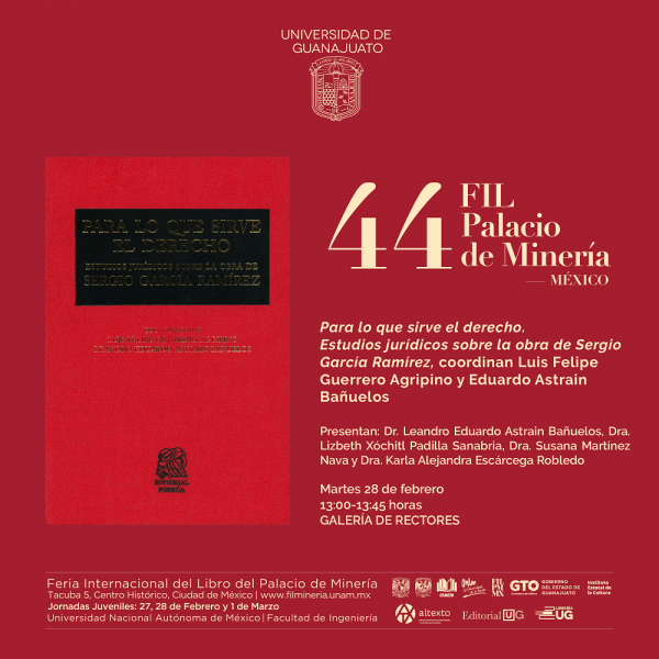 Entre las presentaciones se encuentra “Libro homenaje a la obra y legado del doctor Sergio García Ramírez: Para lo que sirve el derecho. Estudios jurídicos sobre la obra de Sergio García Ramírez” de los coordinadores: Dr. Luis Felipe Guerrero Agripino y Dr. Eduardo Astrain Bañuelos, que se presentará este 28 de febrero a las 13:00 horas en la Galería de Rectores.