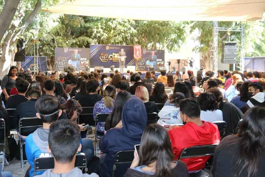 León, Gto., a 14 de febrero de 2023.- Fueron inauguradas las actividades artísticas dentro de la Semana Cultural de la Escuela de Nivel Medio Superior (ENMS) de León de la Universidad de Guanajuato (UG) en el marco de su 145 aniversario de su fundación el 12 de febrero de 1878 con su primer Director Manuel Muñoz Ledo.