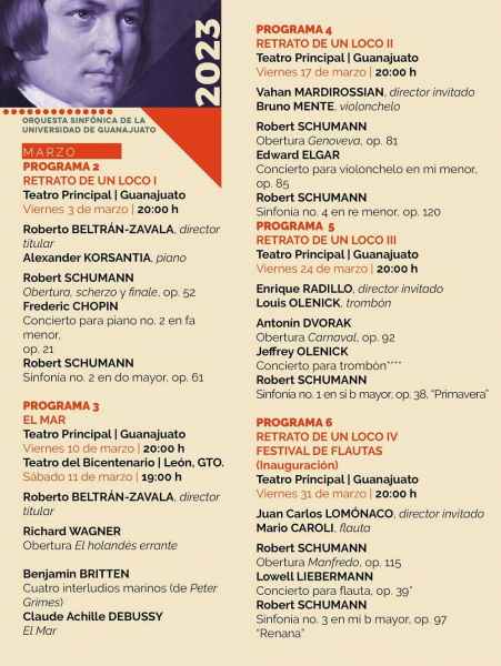 La segunda presentación será un concierto titulado Retrato de un loco, con Roberto Beltrán - Zavala como director titular, y la participación de Alexander Korsantia en el piano. Las piezas a tocar son: de Robert Schumann, Obertura, scherzo y finale, op. 52; de Frederic Chopin el Concierto para piano no. 2 en fa menor, op. 21 y de nueva cuenta Robert Schumann con su Sinfonía no.2 en do mayor, op. 61. La presentación será el 3 de marzo a las 20 horas en el Teatro Principal, siendo el Mesón de San Antonio el lugar para buscar los tickets.