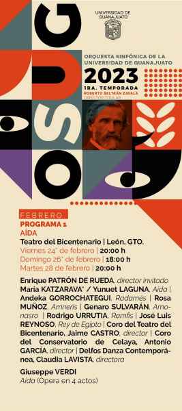 Una de las cartas fuertes para esta semana será las presentaciones de la OSUG. La primera corresponde a la puesta en escena Aida. Como director invitado estará Enrique Patrón de Rueda, mientras que el elenco estará conformado por: María Katzarava y Yunuet Laguna encarnando a Aida; Andeka Gorrochategui como Radamés; Rosa Muñoz como Amneris; Genaro Sulvará como Amonasro; Rodrigo Urrutia como Ramfis; José Luis Reynoso como el Rey de Egipto, así como la participación del Coro del Teatro del Bicentenario bajo la dirección de Jaime Castro, director, además del Coro del Conservatorio de Celaya, con Antonio García como su director, y finalmente, también la participación de Delfos Danza Contemporánea, de la directora Claudia Lavista.