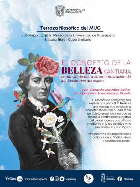 Las Terrazas Filosóficas del MUG (Museo de la Universidad de Guanajuato) siguen abonando en la reflexión de sus asistentes. Esta semana será impartida la charla: El concepto de la belleza kantiana como vía de des instrumentalización de las facultades del sujeto, por parte de Gerardo González Aviña, estudiante de la Licenciatura en Filosofía. La fecha para la misma será el primero de marzo a las 17:30 horas, con entrada libre, pero cupo limitado.