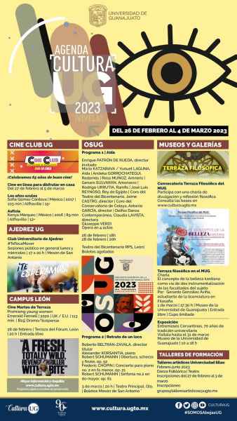 Guanajuato, Gto., a 24 de febrero de 2023.- La última semana del mes de febrero, e inicios del tercer mes del año, tendrá una oferta cultural variada por parte de la Casa de Estudios, entre la que destacan dos obras de teatro musicalizadas por la Orquesta Sinfónica de la Universidad de Guanajuato (OSUG), junto a las charlas, talleres, exposiciones y muestras que ya son una constante semana a semana.
