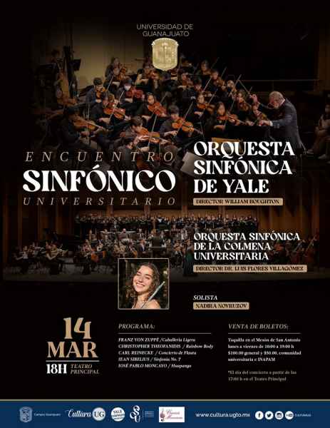 Guanajuato, Gto., a 06 de marzo de 2023.- La Orquesta Sinfónica de Yale (OSY) y la Orquesta Sinfónica de la Colmena Universitaria (OSCU) compartirán escenario el próximo martes 14 de marzo, como parte de la gira que realiza la orquesta norteamericana en suelo mexicano, y que tendrá a la ciudad de Guanajuato como una de sus sedes.