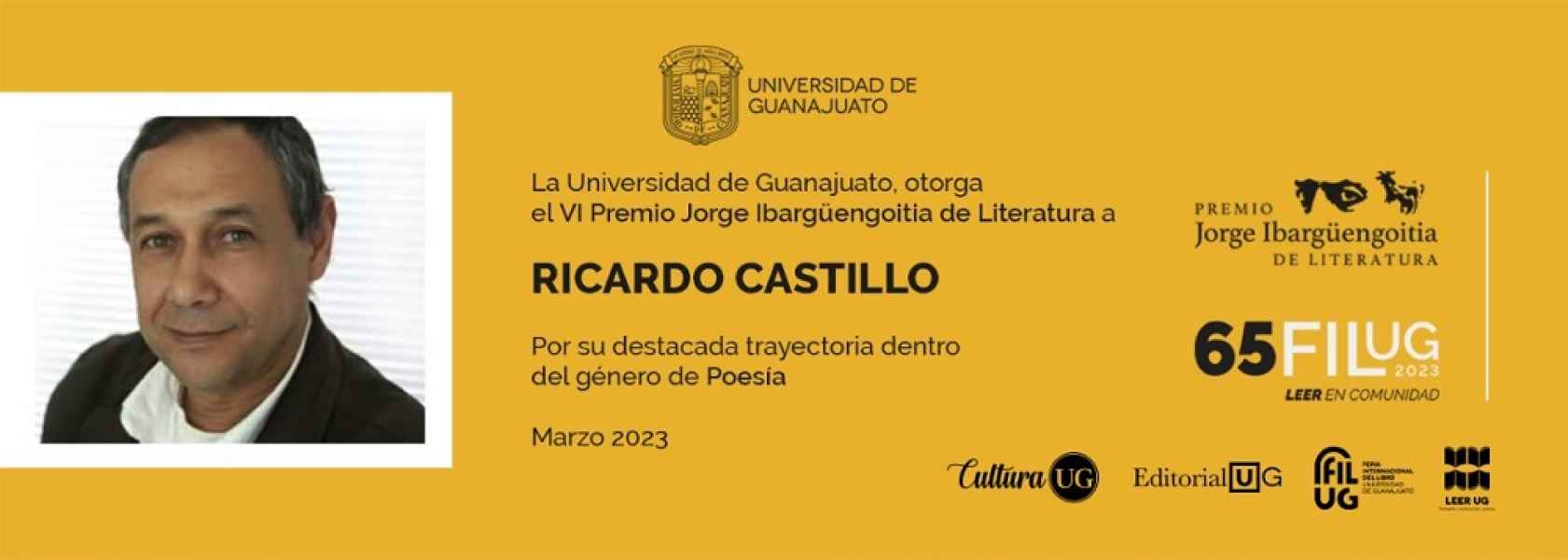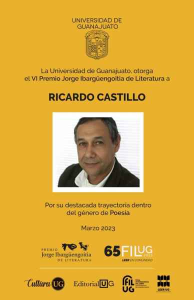 El premio será entregado a Ricardo Castillo por el Dr. Luis Felipe Guerrero Agripino, Rector General de la Universidad de Guanajuato, el 23 de marzo de 2023, durante la Ceremonia de Inauguración de la 65 Feria Internacional del Libro de la Universidad de Guanajuato.