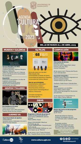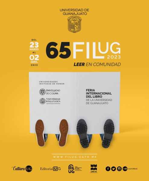 Guanajuato, Gto., a 24 de marzo de 2023.- La agenda cultural de la Universidad de Guanajuato (UG) tendrá del 26 de marzo al primero de abril la parte más fuerte de la Feria Internacional del Libro de Guanajuato (FILUG), así como las actividades artístico-culturales, desde teatro, cine y exposiciones varias.