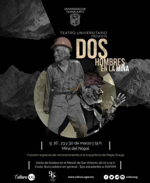 La puesta en escena Dos hombres en la mina encarnada por los miembros del Teatro Universitario, se llevará a cabo en la Mina del Nopal como sede, este 30 de marzo a las 19:00 horas. Boletos disponibles en el Mesón de San Antonio.