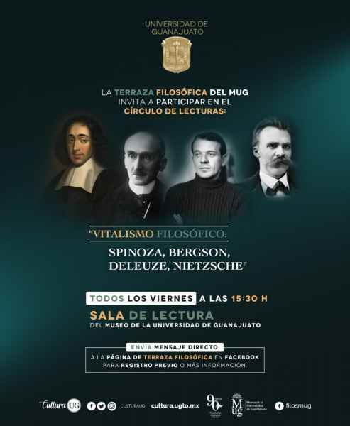 La Terraza filosófica del MUG (Museo de la Universidad de Guanajuato) seguirá con el círculo de lecturas, en esta ocasión con Vitalismo filosófico: Spinoza, Bergson, Deleuze, Nietzsche a las 17:00 horas en la sala de lectura del MUG.