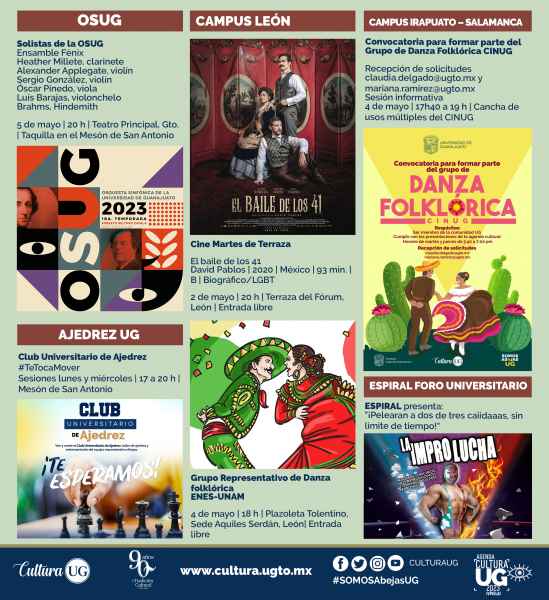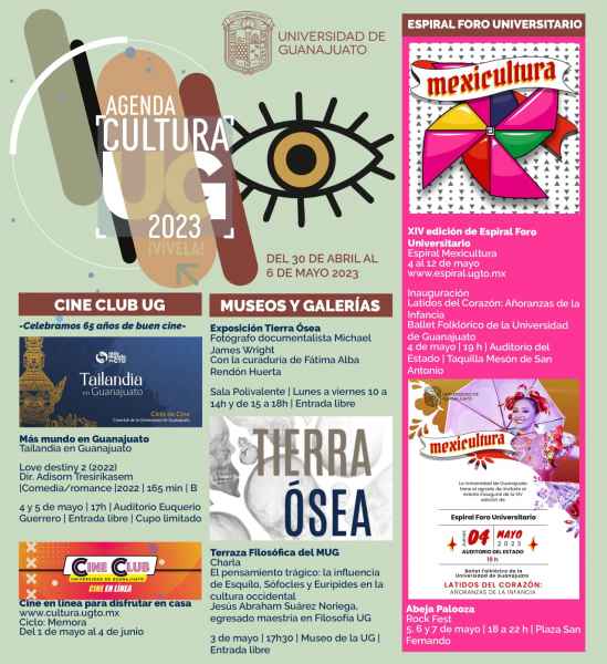Guanajuato, Gto., a 28 de abril de 2023.- Comienza el mes de mayo y con ello, se renueva la oferta cultural de la Universidad de Guanajuato (UG) que, en esta ocasión, ofrecerá una variedad de actividades, tanto para el disfrute del público, como para el esparcimiento de la comunidad de abejas.