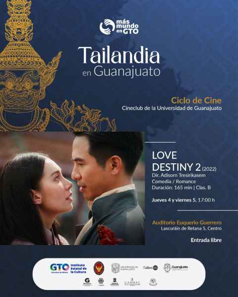 Para iniciar Cine Club de la UG proyectará el próximo cuatro y cinco de mayo la cinta “Love destiny 2”, del director Adisorn Tresirikasem. Esta actividad forma parte del programa "Más mundo en Guanajuato" y se podrá disfrutar en el Auditorio Euquerio Guerrero a las 17:00 horas. La entrada será libre.