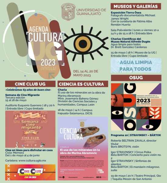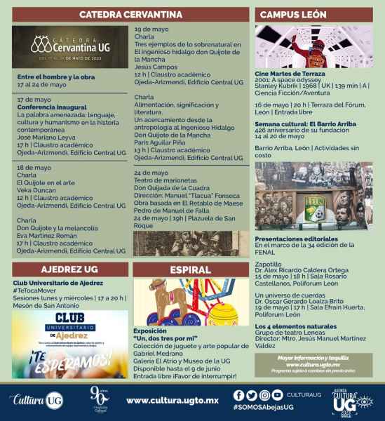 Guanajuato, Gto., a 12 de mayo de 2023.- La agenda cultural de la Universidad de Guanajuato (UG) correspondiente a la tercera semana de mayo, tendrá entre su oferta principal la Cátedra Cervantina, junto a diversas exposiciones, proyecciones y talleres.