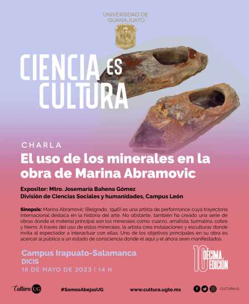 Dentro del programa Ciencia es Cultura, este 18 de mayo tendrá lugar la charla “El uso de los minerales en la obra de Marina Abramovic", con el Mtro. Josemaría Bahena Gómez a las 14:00 horas en el Campus Irapuato-Salamanca.