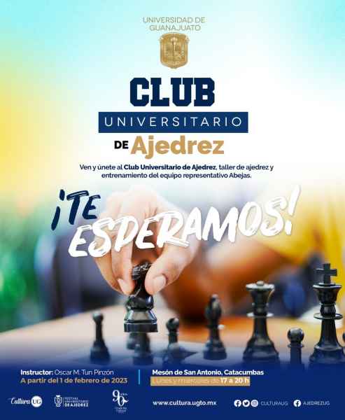 La comunidad UG invita de manera gratuita a las sesiones del Club Universitario de Ajedrez, los lunes y miércoles de 17:00 a 20:00 horas en el Mesón de San Antonio; mientras que el Grupo de Teatro Leneas, invita a la presentación “Los 4 elementos naturales” del Mtro. Jesús Manuel Martínez Valdez este 18 de mayo a las 18:00 horas en el Teatro Jorge Ibargüengoitia, Sede Fórum.