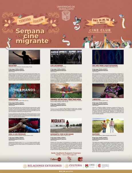 Respecto al séptimo arte de manera gratuita Cine Club alza la mano con la presentación de dos programas, “Cine Migrante” del 15 al 18 de mayo con funciones en el Auditorio Euquerio Guerrero a las 18:00 y 20:00 horas; y Cine en línea para disfrutar en casa, con el ciclo: Memora, que finalizará este 4 de junio, la cartelera puede encontrarse en www.cultura.ugto.mx.