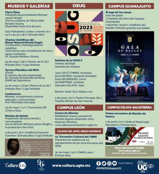 Guanajuato, Gto., a 26 de mayo de 2023.- La agenda cultural de la Universidad de Guanajuato (UG) viene cargada de charlas, exposiciones, cine y música abiertas para todo el público interesado.