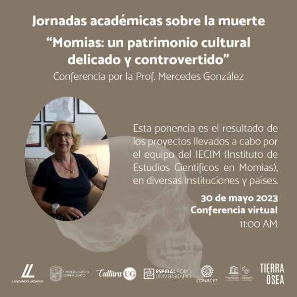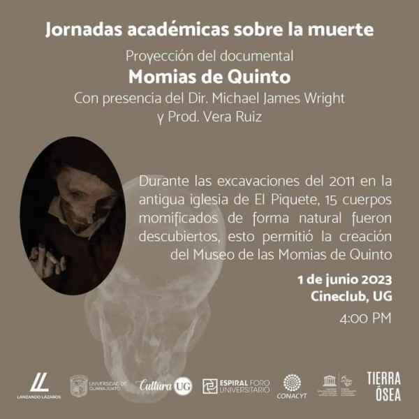 Se presentará la conferencia “Momias: un patrimonio cultural delicado y controvertido” del Profesor Mercedes González el próximo 30 de mayo a las 11:00 horas, mediante una transmisión en el facebook @Tierra Ósea; continuará la proyección del documental “Momias de Quinto” donde posteriormente habrá un conversatorio con el director Michael James Wright y la productora Vera Ruiz, el primero de junio a las 16:00 horas en el Auditorio Euquerio Guerrero.