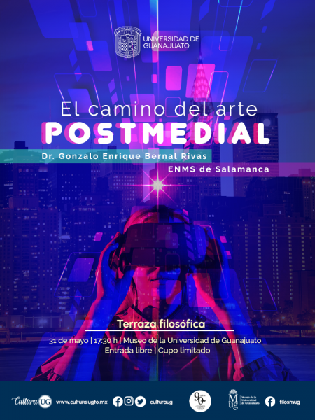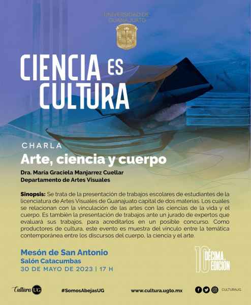 La charla “Arte, ciencia y cuerpo” impartida por la Dra. María Graciela Manjarrez Cuellar este 30 de mayo a las 17:00 horas en el Mesón de San Antonio; en el Museo de la UG (MUG) se presentarán “Combustión y fotodegradación catalítica: Alternativas para remediación de aire y aguas residuales” de la Dra. Claudia Martínez, este 29 de mayo a las 18:00 horas y “El camino del arte postmedial”, del Dr. Gonzalo Enrique Bernal este 31 de mayo a las 17:30 horas.