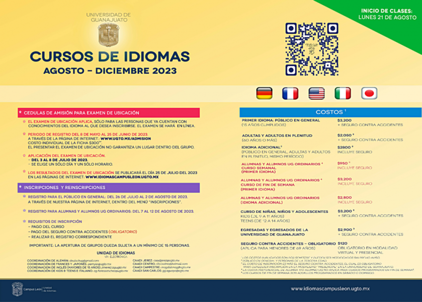 Finalmente, el Campus León abre inscripciones a sus cursos de idiomas, en su modalidad virtual y presencial, para el periodo agosto-diciembre 2023. Mayores informes: www.idiomascampusleon.ugto.mx