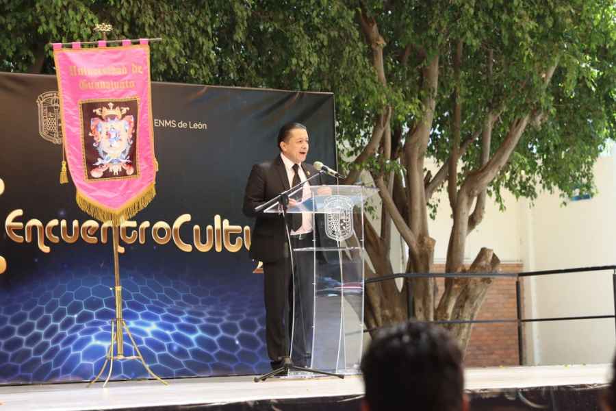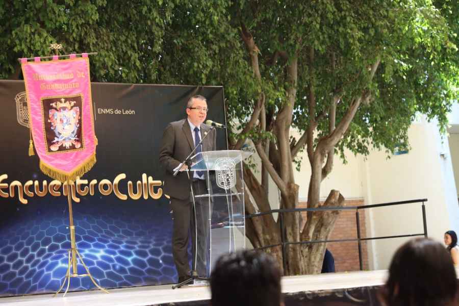 El mensaje de bienvenida estuvo a cargo del Mtro. Benjamín Chávez Muñoz, Director de la ENMS de León, quien platicó un poco sobre la cultura, la cual considera un producto social, ya que todos los días se construye y crea algo nuevo. Añadió que en las instituciones educativas se colabora continuamente en esta área ya que tiene un beneficio para los grupos estudiantiles que permea en la sociedad.
