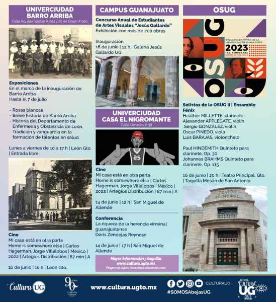 Guanajuato, Gto., 09 de junio de 2023.- Conoce y accede a las actividades culturales que la Universidad de Guanajuato (UG) pone a disposición de su comunidad universitaria y sociedad en general a través de la Dirección de Extensión Cultural, con expresiones de arte desde el cine, la ciencia, música, exhibiciones y demás actividades.