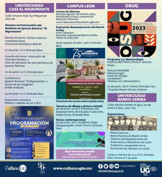 Finalmente, el Campus León invita a formar parte de sus Cursos de idiomas, para el periodo agosto-diciembre 2023, tanto en su modalidad virtual, como la presencial. Mayores informes: www.idiomascampusleon.ugto.mx.