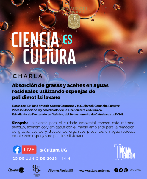 El programa Ciencia es Cultura, ofrecerá dos charlas que podrán ser vista a través del Facebook Live de @Cultura UG, la primera “Absorción de grasas y aceites en aguas residuales utilizando esponjas de polidimetilsiloxano”, impartida por el Dr. José Antonio Guerra Contreras y la M.C. Abygail Camacho Ramírez, este 20 de junio y la charla “Arte y tecnología: Un acercamiento histórico” con la Lcda. Clara Carmina Granados Vázquez, este 23 de junio, ambas a las 14:00 horas.