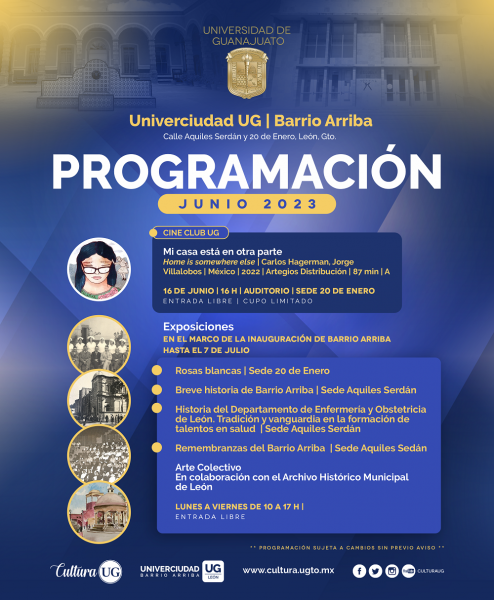 En la sede Univerciudad, Barro Arriba, en León, se llevará a cabo la exposición “Rosas blancas” Breve historia de Barrio Arriba e Historia del Departamento de Enfermería y Obstetricia de León, estará de lunes a viernes de 10:00 a 17:00 horas hasta el 7 de julio. También está disponible la exposición Remembranzas del Barrio Arriba, que finalizará este 5 de julio.