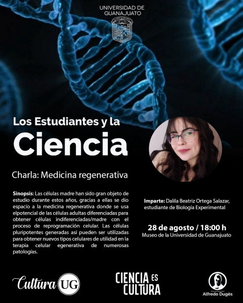 El programa institucional “Ciencia es Cultura” ofrecerá la charla “Medicina Regenerativa”, impartida en el Museo de la UG por Dalila Beatriz Ortega Salazar, este 28 de agosto en punto de las 16:00 horas. De la misma forma, el ciclo “Tardes Literarias”, moderado por Adolfo Quintanar Haro, analizará la obra de la escritora Josefina Vicens en la Librería UG, el miércoles 30 de agosto a las 18:30 horas.
