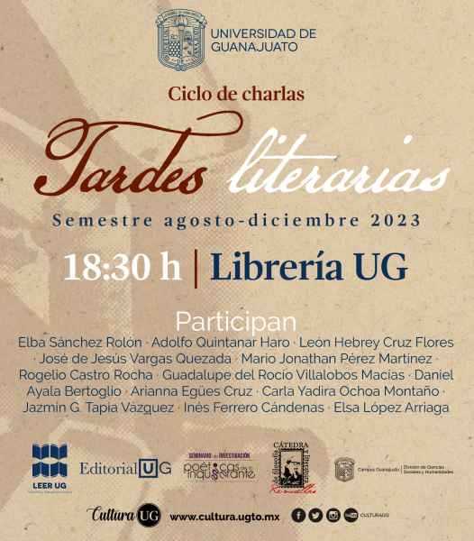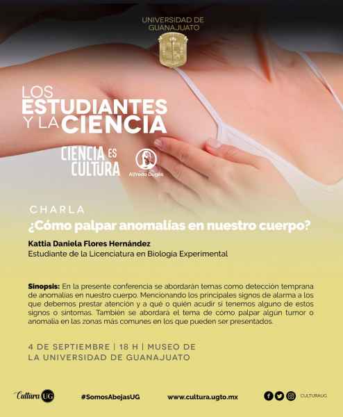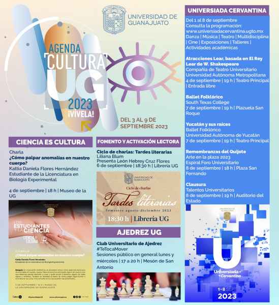 Para estimular el gusto por la lectura, el Ciclo de Charlas “Tardes Literarias” revisará la obra de la novelista mexicana Liliana Blum, en las instalaciones de la Librería UG a las 18:30 horas del 6 de septiembre. De la misma manera, se convoca a participar en la charla “¿Cómo palpar anomalías en nuestro cuerpo?”, que será impartida por la alumna de la Licenciatura en Biología Experimental, Kattia Daniela Flores y que comenzará el 4 de septiembre a las 18:00 horas en el Museo de la Universidad de Guanajuato.
