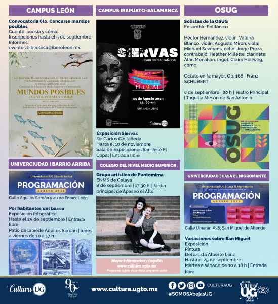 La Orquesta Sinfónica de la Universidad de Guanajuato (OSUG) presentará su “Ensamble Polifónico: Solistas OSUG”, con ocho músicos en escena ejecutando la pieza Octeto en fa mayor, Op. 166 del compositor Franz Schubert. Este evento se realizará el 8 de septiembre a las 20:00 horas en el Teatro Principal de Guanajuato. Los boletos se pueden adquirir en las taquillas del Mesón de San Antonio de lunes a viernes de 9:00 a las 18:00 horas. En dicho recinto y de forma paralela, el Club Universitario de Ajedrez invita a aficionados y a la población estudiantil a sus sesiones de práctica y estudio los días lunes y miércoles de las 17:00 a 20:00.