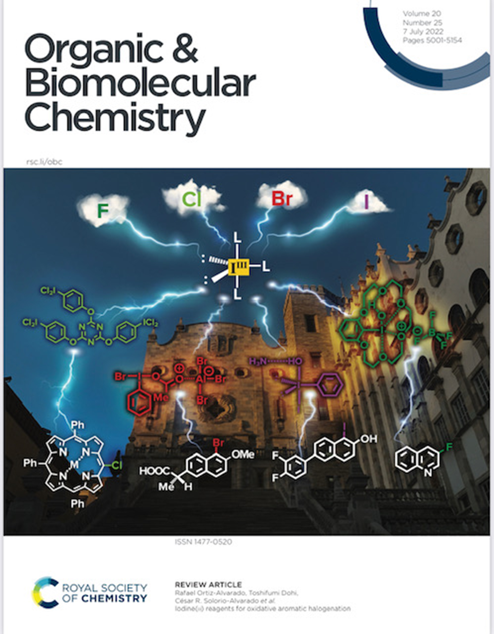 Guanajuato, Gto., a 05 de agosto de 2022.- El artículo "Iodine (III) reagents for oxidative aromatic halogenation" colaboración entre investigadores/as de la Universidad de Guanajuato (UG), la Universidad Michoacana de San Nicolás de Hidalgo (UMSNH) en Morelia, y la Universidad Ritsumeikan en Japón, fue seleccionado como la portada del número 25 de la revista Organic & Biomolecular Chemistry.