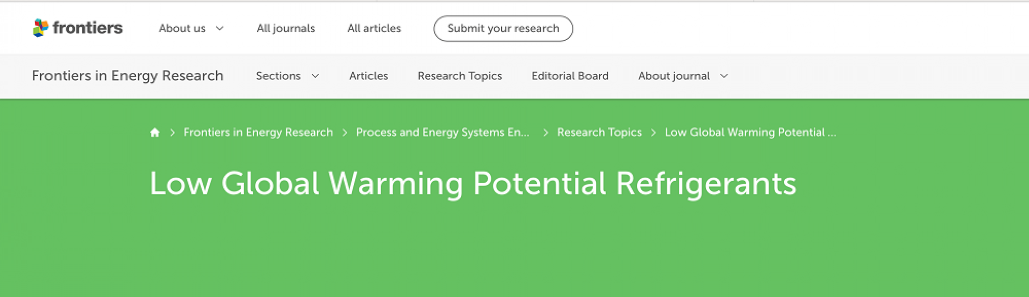 Energy Frontiers es el tomo relacionado al área de energía en ingeniería y éste cubre diversos ámbitos, siendo uno de ellos el de los refrigerantes de bajo potencial de calentamiento atmosférico.