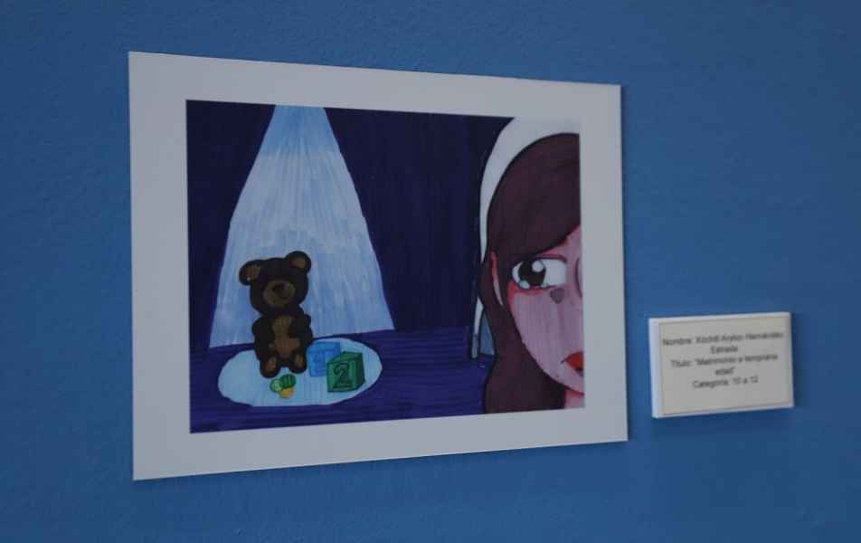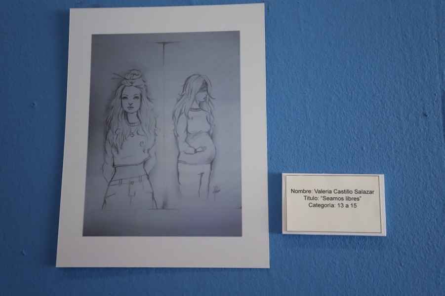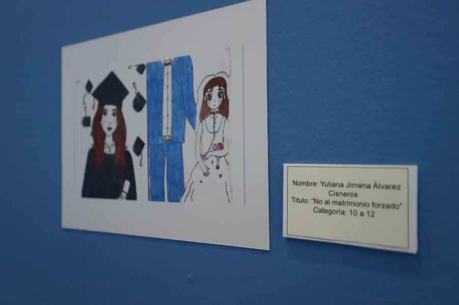 León, Gto., a 08 de febrero de 2023.- Con títulos como: “Todos vemos, nadie te escucha”; “Sueños vs Responsabilidad obligada”; “No al matrimonio infantil”; ¡Yo decido, una etapa a la vez!; “Un futuro encadenado”; “Reflejos de vida”; y “Niñez arrebatada”, la exposición: “Matrimonios y Uniones Infantiles, Tempranas y Forzadas” a través del arte, la niñez guanajuatense levanta la voz a la denuncia social del matrimonio infantil forzado.