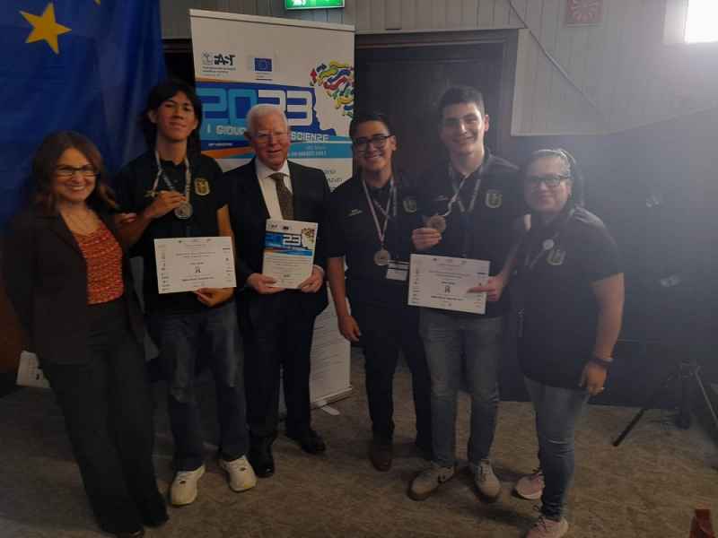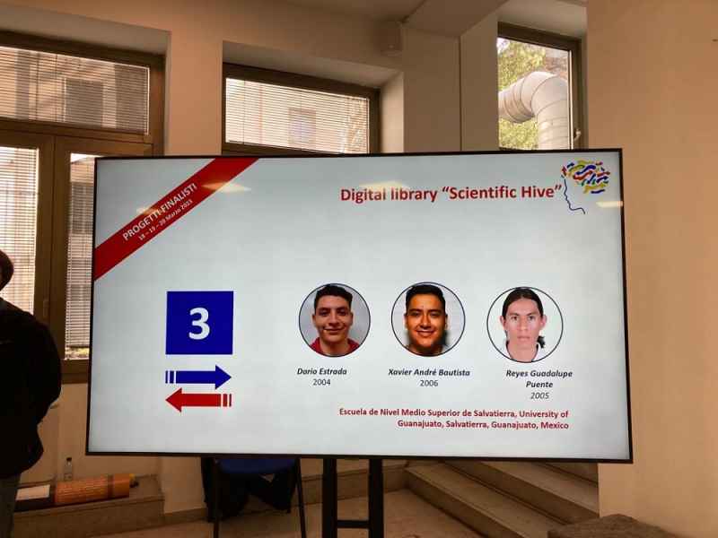 Salvatierra, Gto., a 23 de marzo de 2023.- El grupo de estudiantes de la Escuela de Nivel Medio Superior (ENMS) de Salvatierra conformado por Reyes Guadalupe Puente Balcázar del sexto semestre del bachillerato de Ingenierías, Xavier André Bautista Cisneros del cuarto semestre y Darío Estrada Camargo recién egresado del bachillerato –quien participó por el pase internacional aun siendo estudiante-, asesorados por la Mtra. Hilda Lucía Cisneros López, obtuvieron el segundo lugar y medalla de plata en el prestigioso concurso internacional “I Giovani e le scienze” (Los jóvenes en la ciencia), con el proyecto denominado “Colmena científica”.