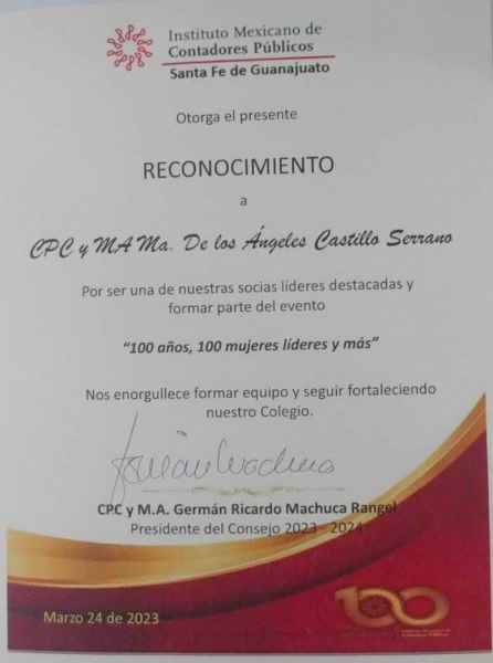 Guanajuato, Gto., a 19 de abril de 2023.- En el marco de los 100 años de la creación del Instituto Mexicano de Contadores Públicos (IMCP), se reconoció la trayectoria y liderazgo de la Mtra. María de los Ángeles Castillo Serrano, adscrita a la División de Ingenierías del Campus Guanajuato de la Universidad de Guanajuato (UG).