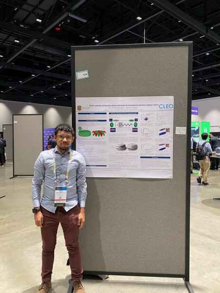 Salamanca, Gto. a 24 de mayo de 2023.- Erick Ramón Baca Montero, alumno del doctorado en Ingeniería Eléctrica de la Universidad de Guanajuato (UG), presentó los resultados de su trabajo de investigación en el Congreso Internacional sobre Láseres y Electroóptica 2023 (CLEO, por sus siglas en inglés) donde fue finalista con su cartel, durante el concurso de los pósters de la División de Ciencias del Láser de la Sociedad Estadounidense de Física.