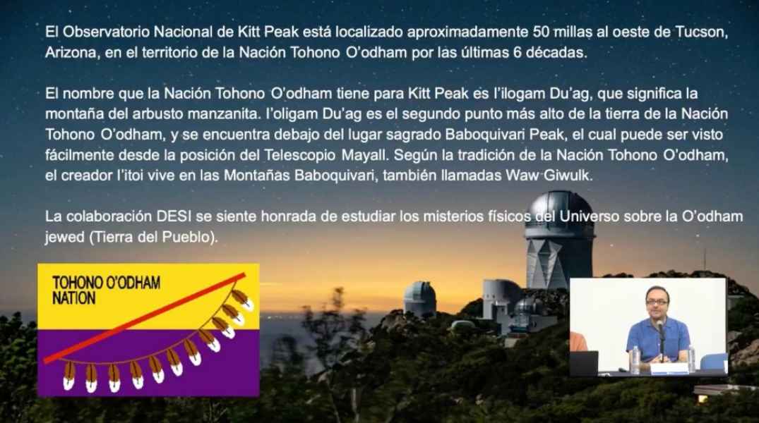 La colaboración DESI tiene el honor de poder realizar investigaciones científicas en Iolkam Du'ag (Kitt Peak), una montaña con un significado particular para la Nación Tohono O'odham, cuyo territorio se extiende tradicionalmente entre E.U.A. y México.