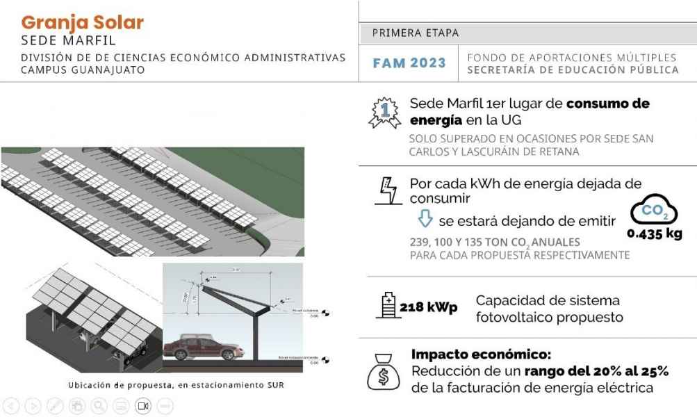 La elección de la Sede Marfil es debido a su alto consumo de energía eléctrica. Con estas acciones el sistema fotovoltaico incidirá directamente en el ahorro de entre un 20 y 25 % del importe del servicio eléctrico de esta sede y por ende de la UG. A la par, este sistema fotovoltaico tendrá una capacidad de generación de 218 kWp podría generar hasta 1.31 MWh, lo que representa dejar de emitir 0.49 Ton de CO2 al día.