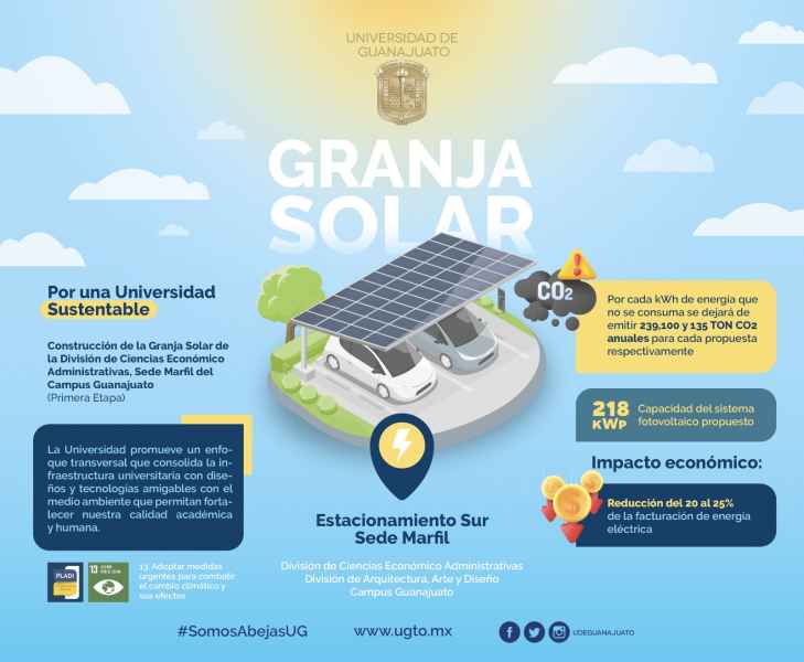 Guanajuato, Gto., a 10 de julio de 2023.- Dará inicio en la Universidad de Guanajuato (UG) la primera etapa de construcción de una Granja Solar en la División de Ciencias Económico Administrativas (DCEA), Sede Marfil del Campus Guanajuato, con el objetivo de obtener una sustentabilidad energética y la disminución de la huella de carbono.