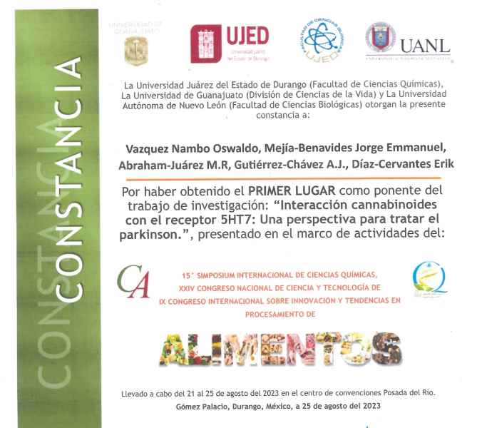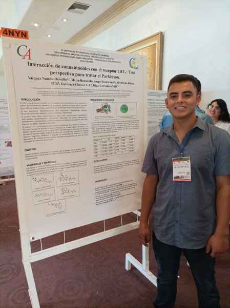 Tierra Blanca, Gto. a 30 de agosto de 2023.- Oswaldo Vázquez Nambo, alumno del programa de Ingeniería en Alimentos del Centro Interdisciplinario del Noreste de la Universidad de Guanajuato (CINUG) fue premiado por su trabajo de investigación "Interacción de cannabinoides con el receptor 5HT7: Una perspectiva para tratar el Parkinson”.