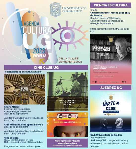 En el mencionado recinto del 19 al 21 de septiembre, el Festival Internacional de Cortometrajes ‘Shorts México’ exhibirá producciones de la nueva generación de directores mexicanos desde las 17:00 hasta las 21:00 horas con entrada libre. Además, el ciclo de cine ‘Mentalidades en Foco’ continuará sus actividades de forma remota hasta el 8 de octubre con la proyección de ocho películas disponibles en la página www.cultura.ugto.mx