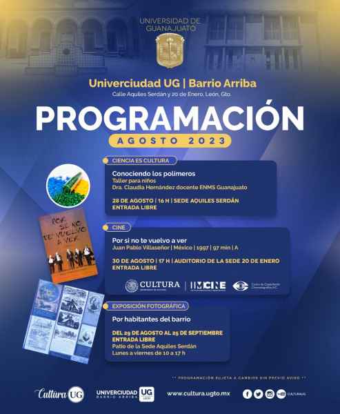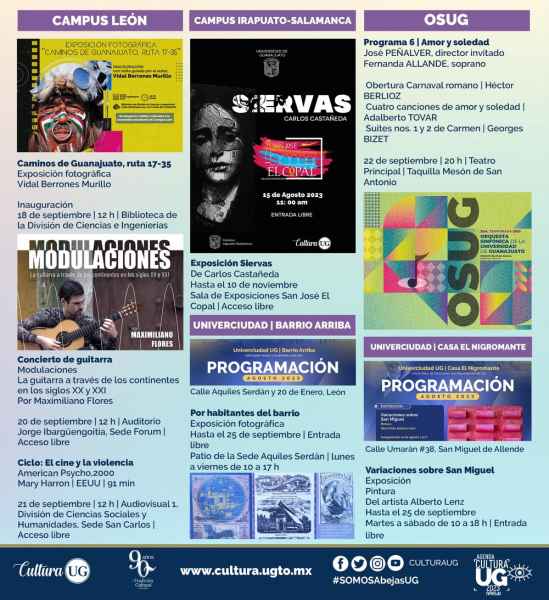 Así mismo el Campus León convoca a la inauguración de la exposición fotográfica ‘Caminos de Guanajuato. Ruta 17-35’, de Vidal Berrones Murillo, a las 12:00 horas este 18 de septiembre en la Biblioteca de la División de Ciencias e Ingenierías; también se invita a presenciar la exposición fotográfica ‘Por habitantes del barrio’ en la Univerciudad Barrio Arriba, ubicada entre las calles Aquiles Serdán y 20 de enero, vigente hasta el 25 de septiembre de lunes a viernes de 10:00 a 17:00 horas