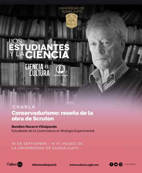 Para examinar la obra del filósofo británico Roger Scruton, el programa ‘Ciencia es Cultura’ invita a la charla ‘Conservadurismo: reseña de la obra de Scruton’ impartida por el estudiante de la Licenciatura en Biología, Bandien Navarro Villalpando, a las 18:00 horas del próximo 18 de septiembre en el Museo de la UG.