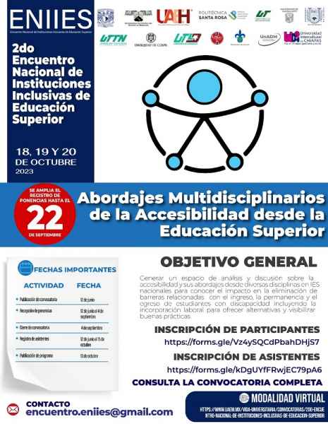 También se busca construir espacios de análisis y de diálogo entre el estudiantado con discapacidad de la comunidad universitaria; difundir prácticas de extensión e investigación realizadas para la eliminación de las barreras a la accesibilidad física, a las tecnologías de la información y comunicación en las IES, y visibilizar los retos en el cumplimiento de las normativas internacionales y nacionales para la atención de la comunidad universitaria con discapacidad relacionadas con la accesibilidad.