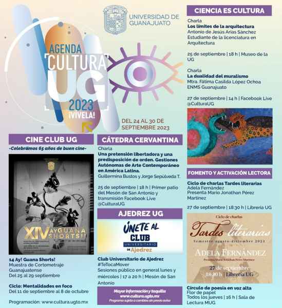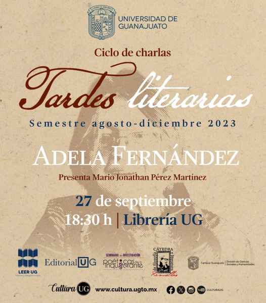 Como parte del programa “Fomento y Activación Lectora” se convoca a participar en el ciclo de charlas “Tardes Literarias”, presentada en esta ocasión por Mario Jonathan Pérez Martínez y en donde se hará reflexión de la obra de la escritora mexicana Adela Fernández, a realizarse el 27 de septiembre a las 18:30 horas en la Librería UG. De igual forma, el Circulo de Poesía en Voz Alta presenta el proyecto estudiantil “Flor de Papel”, todos los jueves del presente mes en la Sala de Lectura del Museo de la Universidad de Guanajuato en punto de las 16:00 horas.