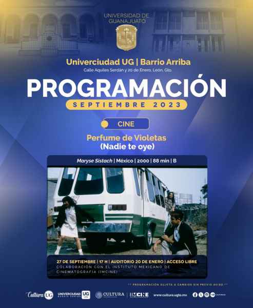 Sobre el mismo campus, en la Univerciudad Barrio Arriba se exhibirá “Perfume de Violetas” (2000), cinta ganadora de cinco Premios Ariel de la Academia Mexicana de Artes y Ciencias Cinematográficas (AMACC), esto en el auditorio “20 de enero” a las 17:00 horas del 27 de septiembre y con entrada libre. También, la exposición fotográfica “Por habitantes del barrio”, permanece abierta al público en el Patio de la Sede Aquiles Serdán, de lunes a viernes de 10:00 a 17:00 horas.