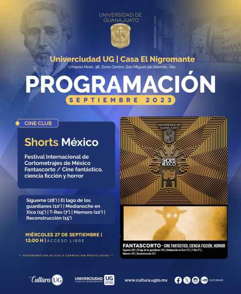 En San Miguel de Allende, la Univerciudad Casa El Nigromante acogerá el Festival Internacional de Cortometrajes “Shorts México” con los géneros: cine fantástico, de ciencia ficción y horror, a proyectarse el próximo 27 de septiembre iniciando a las 12:00 horas y con entrada libre. Asimismo, el 25 de septiembre será la fecha límite para asistir a la exposición “Variaciones sobre Miguel Ángel” del pintor Alberto Lenz, de martes a sábado de las 10:00 a las 18:00 horas.