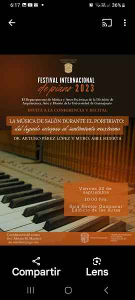Guanajuato, Gto., a 25 de septiembre de 2023.- Continúa en la Universidad de Guanajuato (UG) las actividades del Festival Internacional de Piano 2023, auspiciadas por el Departamento de Música y Artes Escénicas (DEMAE) de la División de Arquitectura, Arte y Diseño (DAAD) del Campus Guanajuato, en esta ocasión, con la participación del Dr. Arturo Pérez López y el Mtro. Abel Huerta.