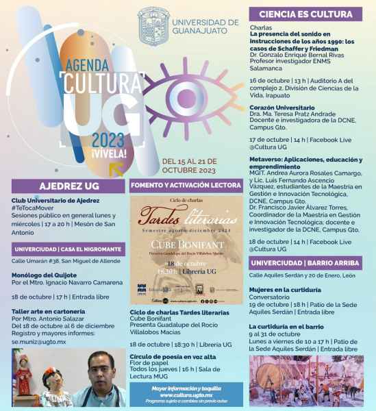 Además de su oferta dentro del FIC, la UG continúa con sus actividades culturales como la charla “La presencia del sonido en instrucciones de los años 1990: los casos de Schaffer y Friedman” del Dr. Gonzalo Bernal la cita será este 16 de octubre a las 13:00 horas en la División de Ciencias de la Vida en Irapuato.