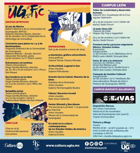 El Cine Club UG estará presente con más de 30 cintas dentro del FIC, que podrán consultarse en https://www.cultura.ugto.mx donde también se podrá conocer la oferta de arte gráfica y visual a partir de este 13 de octubre hasta enero de 2024 en las diversas galerías universitarias.
