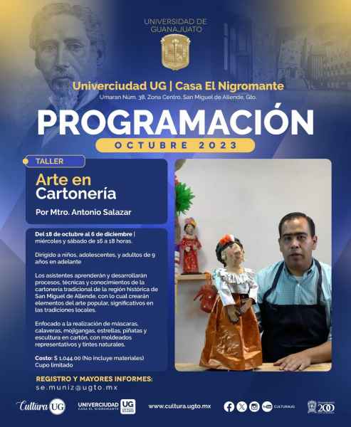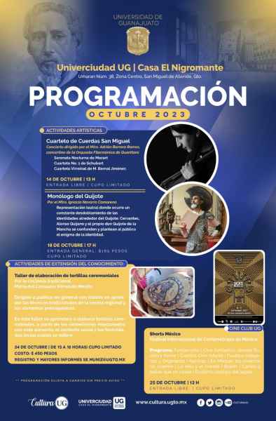 En la Univerciudad Casa Nigromante en Umarán 38, San Miguel de Allende estará el “Monólogo del Quijote” por el Mtro. Ignacio Navarro este 18 de octubre a las 17:00 horas; y del 18 de octubre al 6 de diciembre se invita al “Taller arte en cartonería” impartido por el Mtro. Antonio Salazar. Informes: Esta dirección de correo electrónico está protegida contra spambots. Usted necesita tener Javascript activado para poder verla.